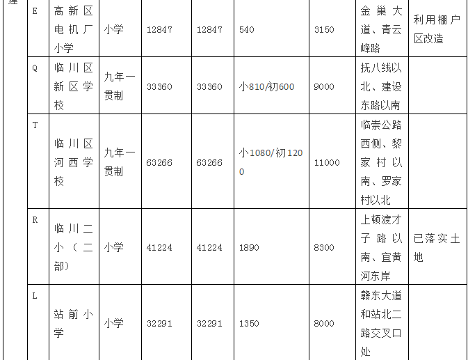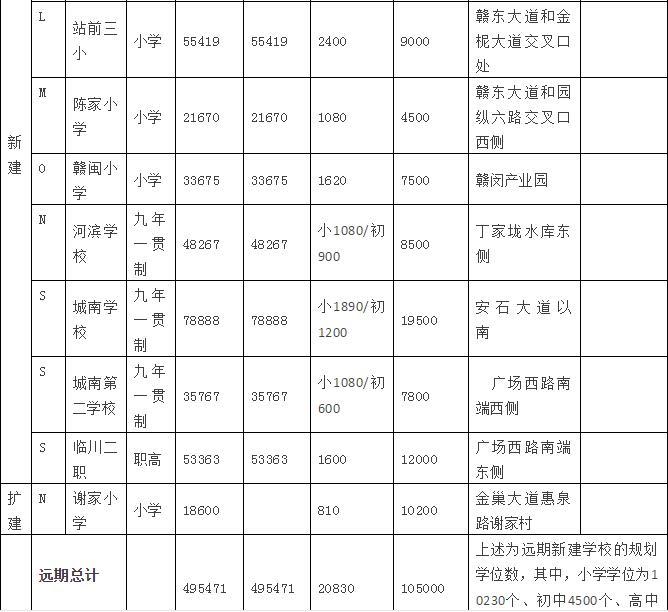 臨川遠(yuǎn)期臨川城區(qū)主要以新建學(xué)校作為對(duì)教育資源的補(bǔ)充,新建4所小學(xué),為東岸小學(xué)、站前三小、陳家小學(xué)、贛閩小學(xué);新建3所九年一貫制學(xué)校,為河濱學(xué)校、城南學(xué)校、城南第二學(xué)校;擴(kuò)建1所小學(xué),為謝家小學(xué);新建1所完全中學(xué),為高新區(qū)完全中學(xué);新建1所職業(yè)高中,為臨川二職。