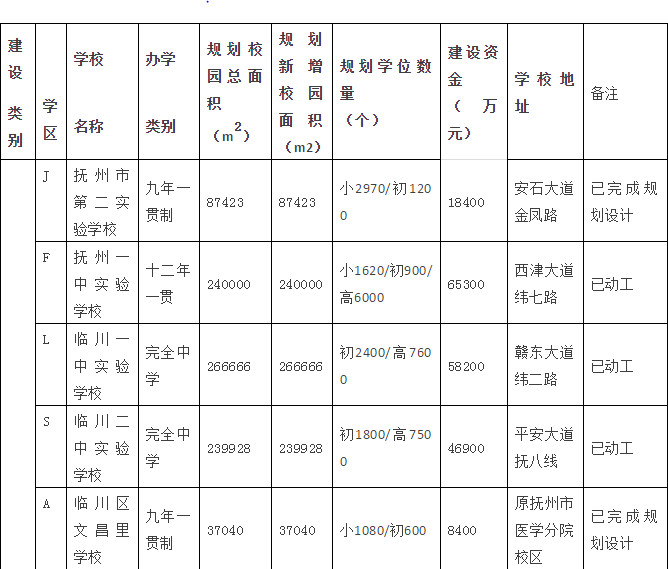 近期臨川城區(qū)新建5所小學(xué),為電機(jī)廠小學(xué)、臨川十五小、金安小學(xué)、站前小學(xué)、臨川二小二部;新建9所九年一貫制學(xué)校,為文昌里學(xué)校、名仕學(xué)校、汝水學(xué)校、曾鞏學(xué)校、竹山學(xué)校、撫州市第二實(shí)驗(yàn)學(xué)校、城北學(xué)校、新區(qū)學(xué)校、河西學(xué)校;新建3所民辦性質(zhì)的實(shí)驗(yàn)學(xué)校,為撫州一中實(shí)驗(yàn)學(xué)校、臨川一中實(shí)驗(yàn)學(xué)校、臨川二中實(shí)驗(yàn)學(xué)校;新建2所特殊教育學(xué)校,為撫州市特教學(xué)校和臨川區(qū)特殊學(xué)校(異地新建)。