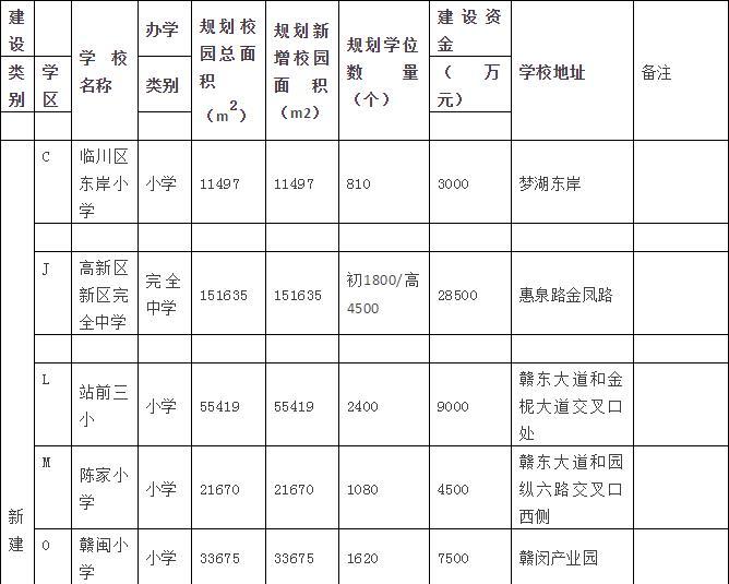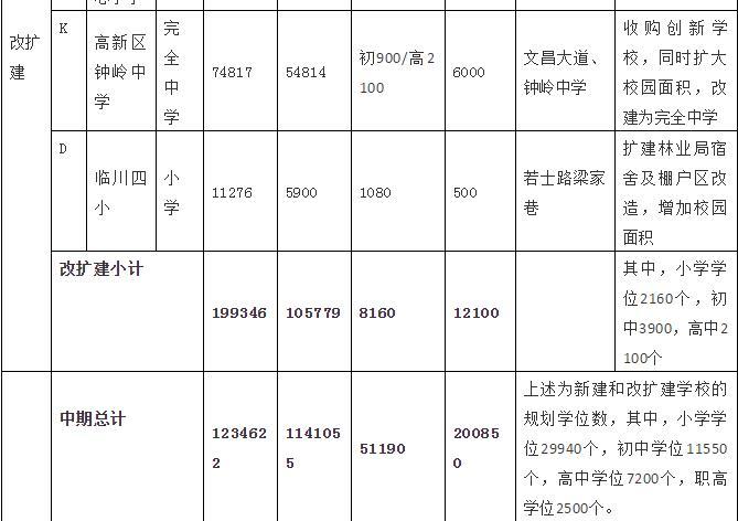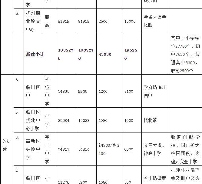 中期擴(kuò)建2所小學(xué),為臨川四小和撫北中心小學(xué);擴(kuò)建1所初中,為臨川四中;改擴(kuò)建鐘嶺中學(xué)(收購(gòu)創(chuàng)新學(xué)校,同時(shí)擴(kuò)大校園面積)為完全中學(xué)。
