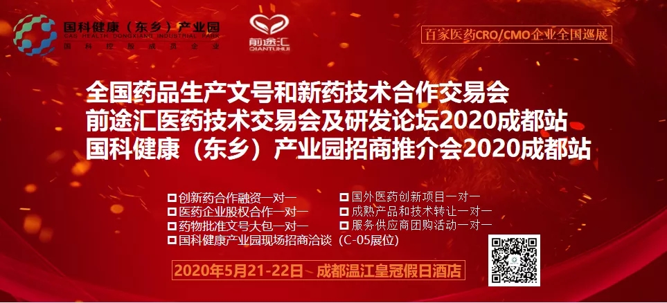 國科健康(東鄉(xiāng))產(chǎn)業(yè)園與醫(yī)藥前途匯聯(lián)合舉辦的“全國藥品生產(chǎn)文號和新藥技術合作交易會、前途匯醫(yī)藥技術交易會及研發(fā)論壇2020成都站、國科健康(東鄉(xiāng))產(chǎn)業(yè)園招商推介會2020成都站”將于2020年5月21——22日在成都溫江假日酒店開幕,誠邀醫(yī)藥、醫(yī)療、大健康行業(yè)企業(yè)共襄盛舉!